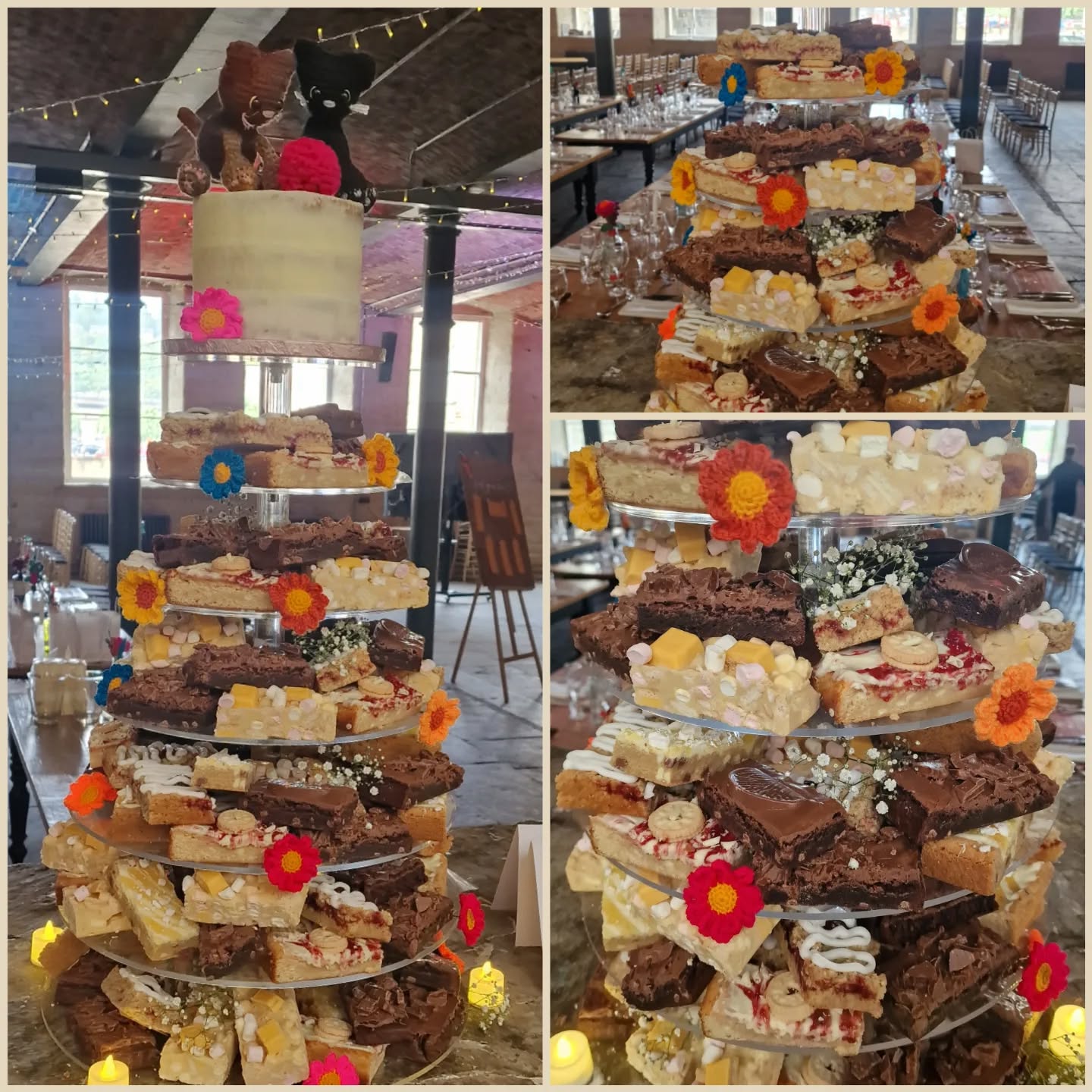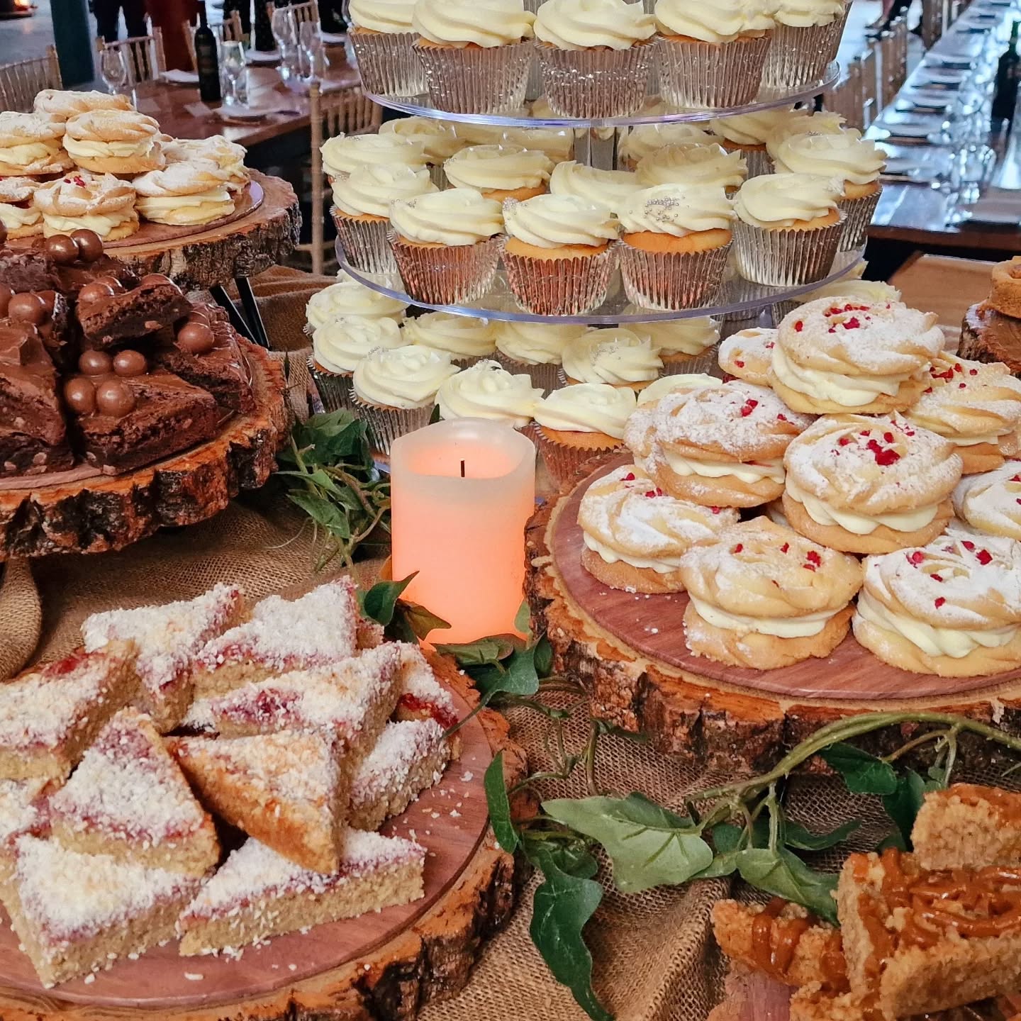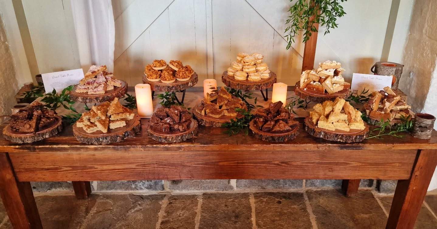 We specialise in Dessert Tables and come and set them up for you and can even provide all the stands, we have various stands and an array of logs to hire.  Dessert tables include a large selection of brownies, cookies, donuts, cupcakes, cakes and more, all are freshly baked and personal to you. They are great especially at evening receptions instead of venue desserts.